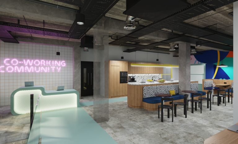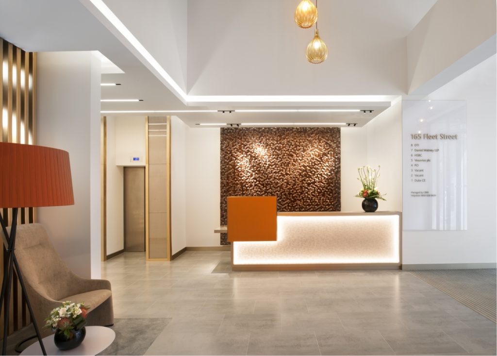Resonate were approached to re-design the Entrance lobby and CAT A floors. We set about providing some sparkle and a bit of drama to a tired space. The scheme needed to work for a multi tenanted building and provide a warm and welcoming environment to a variety of occupiers. With the planners an Entrance Portal design was agreed and implemented in a steel grey to complement the existing vernacular.