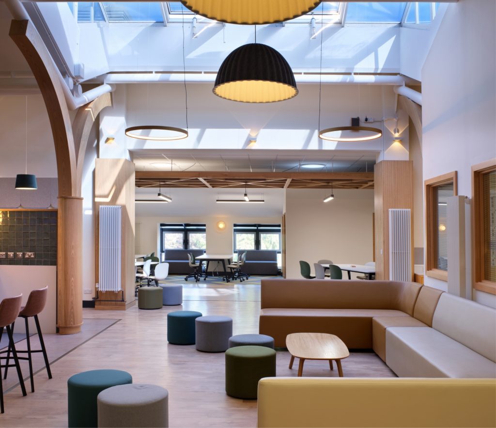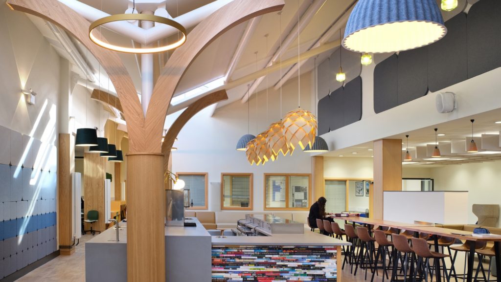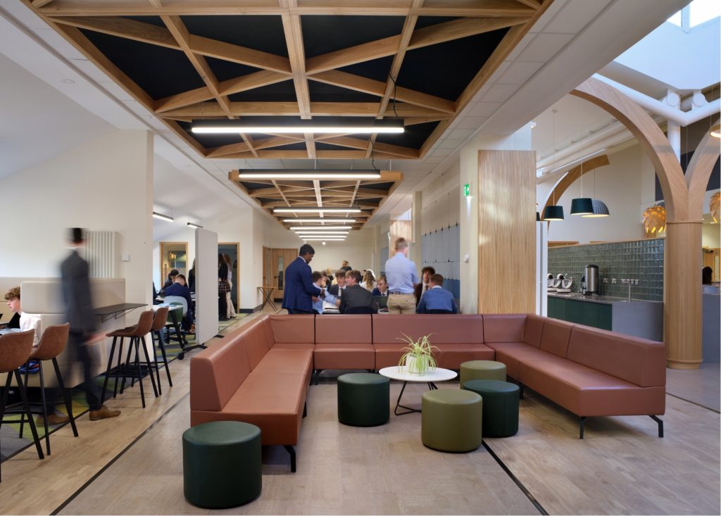 Resonate were appointed to design an inspiring new Sixth Form for Southampton based school King Edward VI. The design includes flexible and collaborative spaces, quiet study areas and a relaxed and informal café. With sustainability and student comfort at the heart of the design – our environmental approach and design concepts were approved by 95% of the students. This is now a thriving 6th form hub for the students to collaborate and learn.